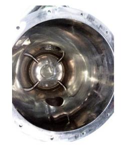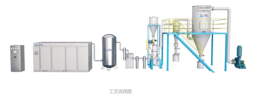 壓縮空氣經(jīng)過(guò)濾干燥后,通過(guò)拉瓦爾噴嘴高速?lài)娚淙敕鬯榍?,在多股高壓氣流的交匯點(diǎn)處物料被反復(fù)碰撞、磨擦、剪切而粉碎,粉碎后的物料在風(fēng)機(jī)抽力作用下隨上升氣流運(yùn)動(dòng)至分級(jí)區(qū),在高速旋轉(zhuǎn)的分級(jí)渦輪產(chǎn)生的強(qiáng)大離心力作用下,粗細(xì)物料分離,符合粒度要求的細(xì)顆粒通過(guò)分級(jí)輪進(jìn)入旋風(fēng)分離器和除塵器收集,粗顆粒下降至粉碎區(qū)繼續(xù)粉碎。